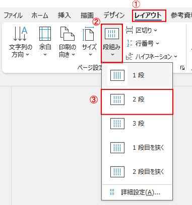 2. [レイアウト] タブ > [段組み][2段] をクリック。