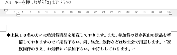 文章全体を範囲指定して下さい。ぶら下げインデントを「3」までドラッグして下さい。