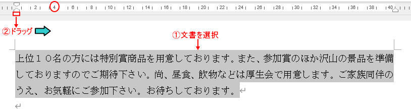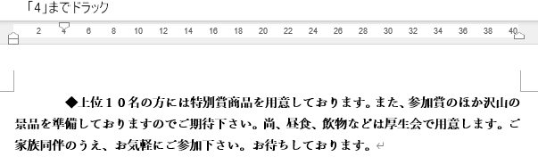 - この四角(左インデント)を、目盛りの「4」までドラッグします。動かしたい文章全体をドラッグして選択します。