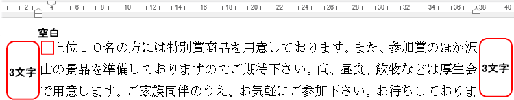 次は、「左を3文字、右も3文字空けて、中央に寄せたい」という時のように、数字で正確に指定する方法です。 「引用文」や「注意書き」を作る時によく使います。