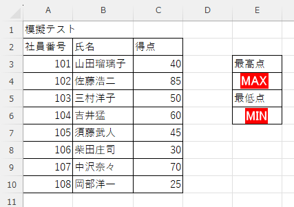 次に、画像内の「最低点(セル E6)」に答えを出してみましょう。