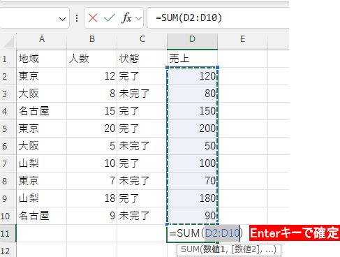 セル D11 に、D2:D10 の 合計(SUM) を求めなさい。