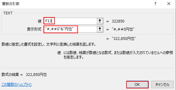 - 「値」に【F13】(総計)を選択して、「表示形式」に「#,##0」を入力したら「”&”円也”」を入力して「OK」。