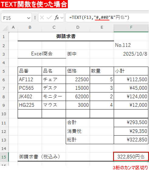 - 御請求金額(税込)【F15】にTEXT関数を使い「金額」と「円也」を表示する。