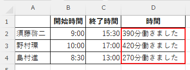 - TEXT関数で、開始時間から終了時間までの「分」と「働きました」の文字列を表示します。